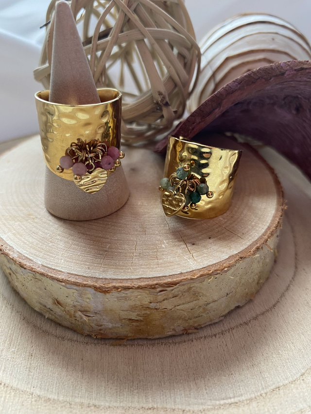 Bagues larges, effet écaillé, en acier inoxydable composées d'une pampille ovale et de petites pierres de jaspe vert ou de rhodonite.