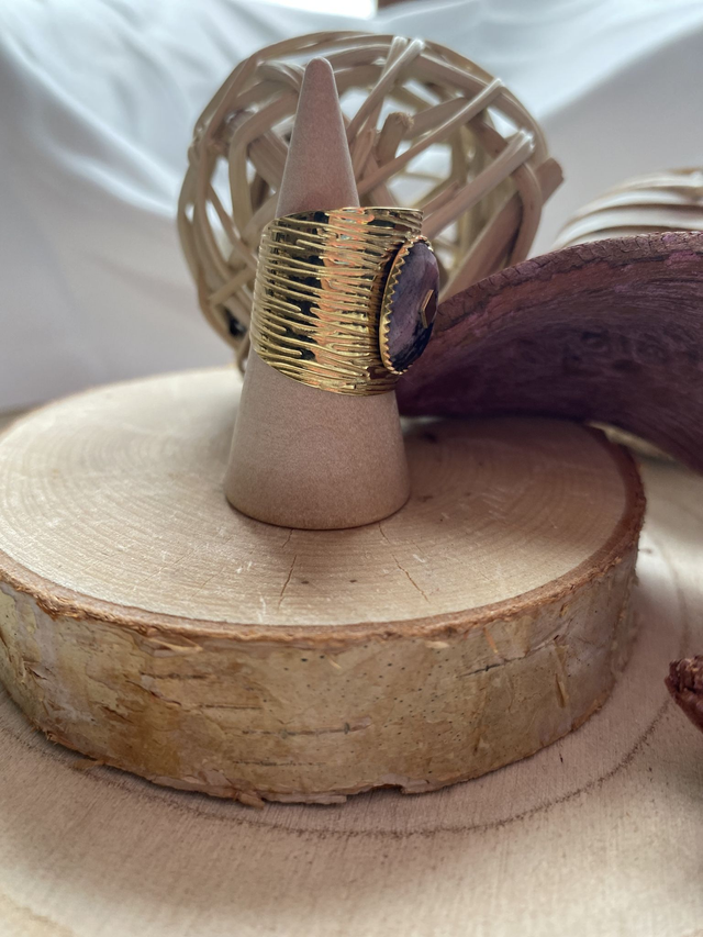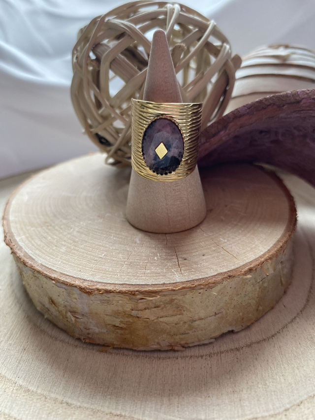 Bague en acier inoxydable dorée ornée d’une magnifique pierre naturelle marbrée