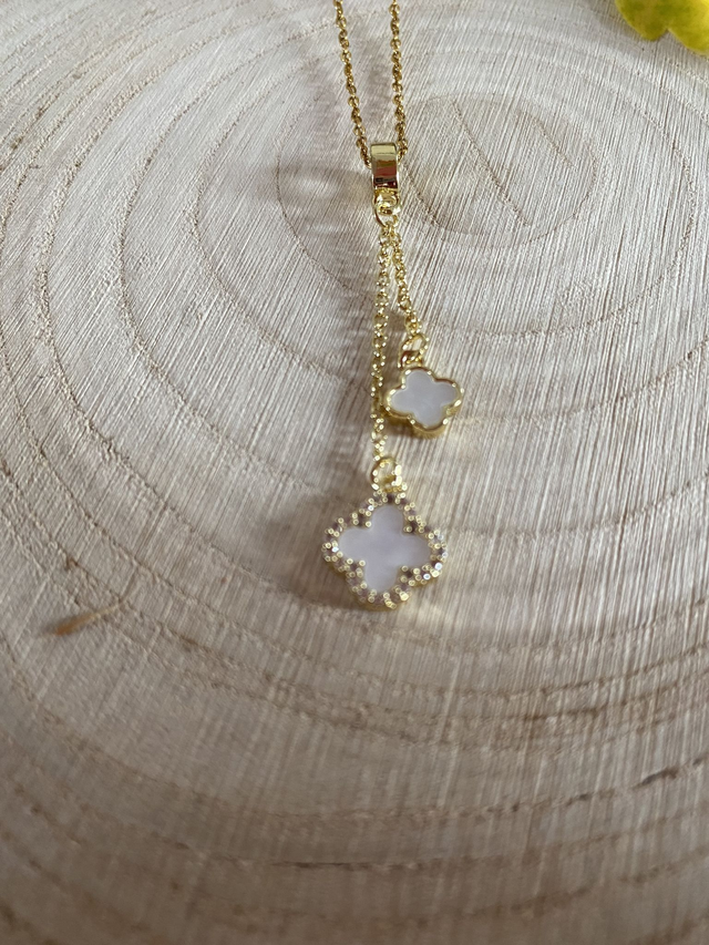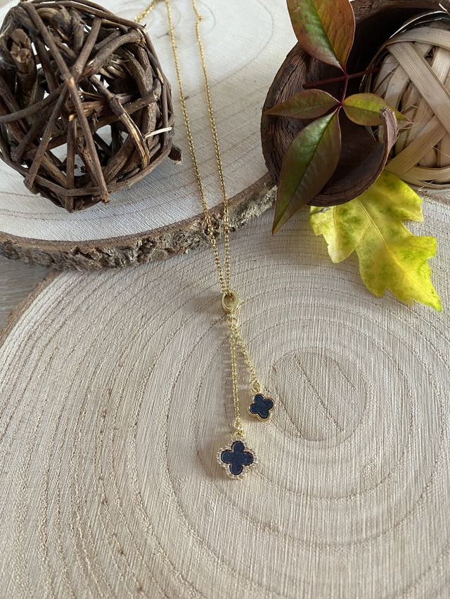 Sautoir avec 2 treflés en pendentif, le plus gros est orne de strass